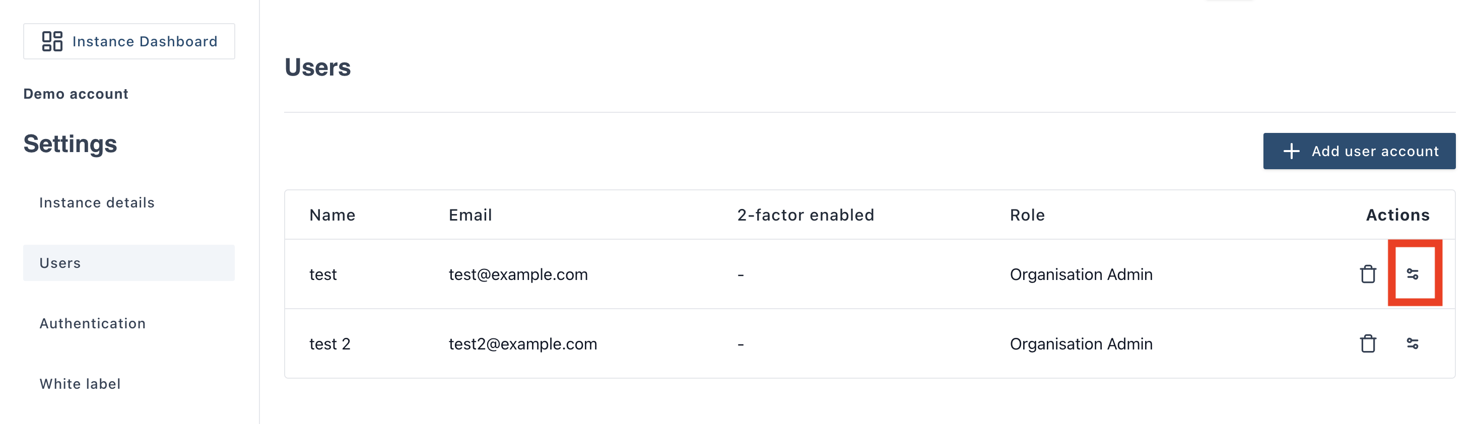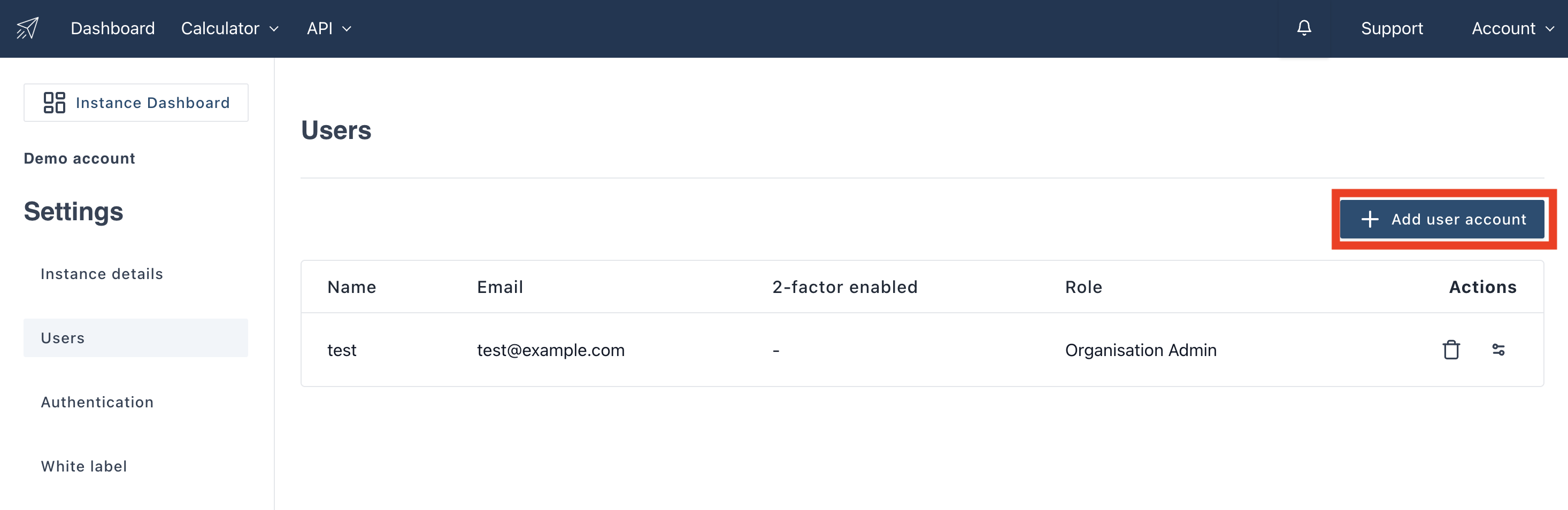 To add users to the instance you are in click on the button “Add user account”.