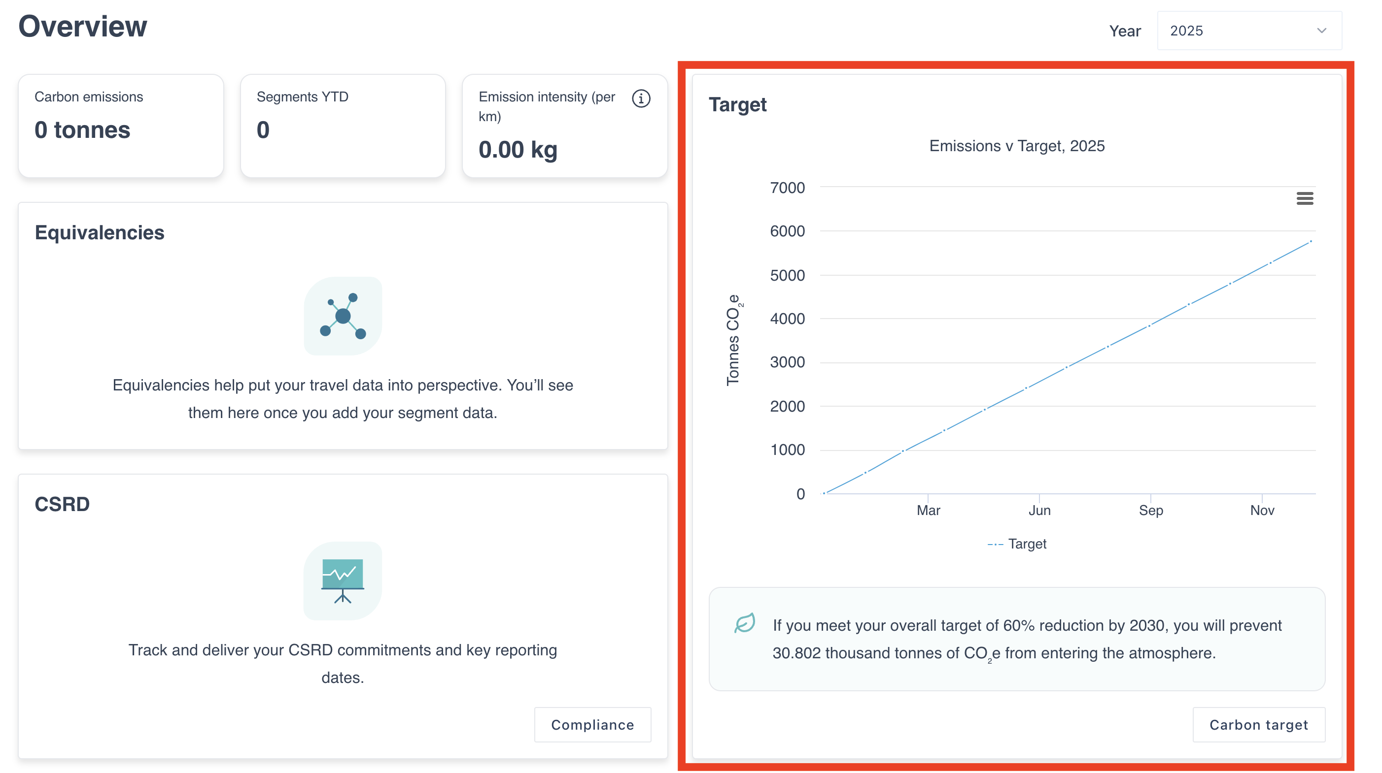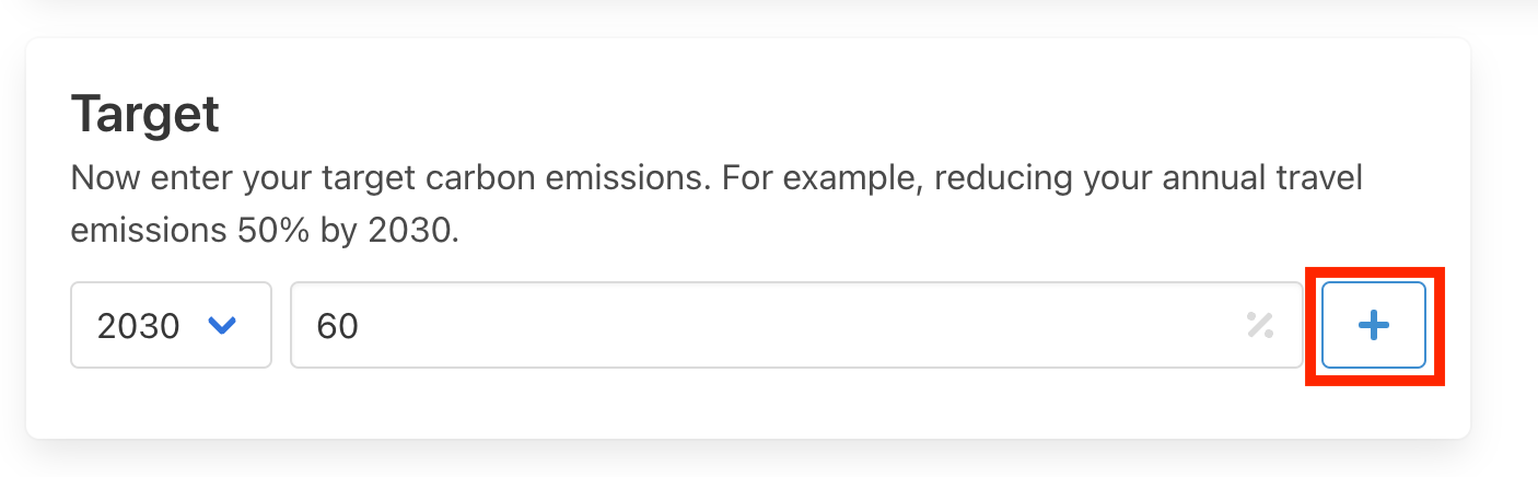 In this “Target” tab you need to specify the year in which you want to achieve the target and the % reduction of carbon emissions for your travel program by this date. As shown below for this example a reduction of 60% by 2030 is the target. Next press the “+” button to confirm your selection.