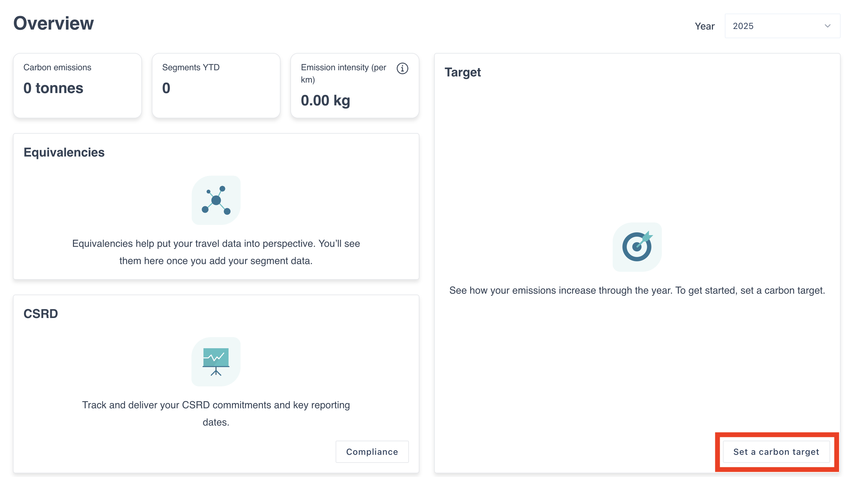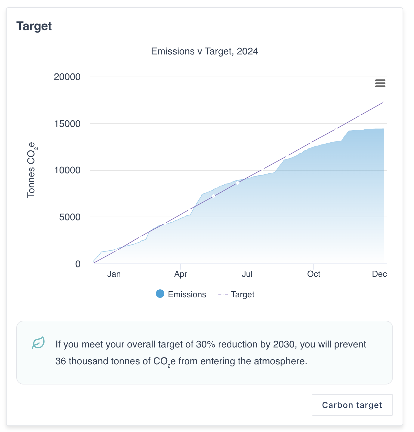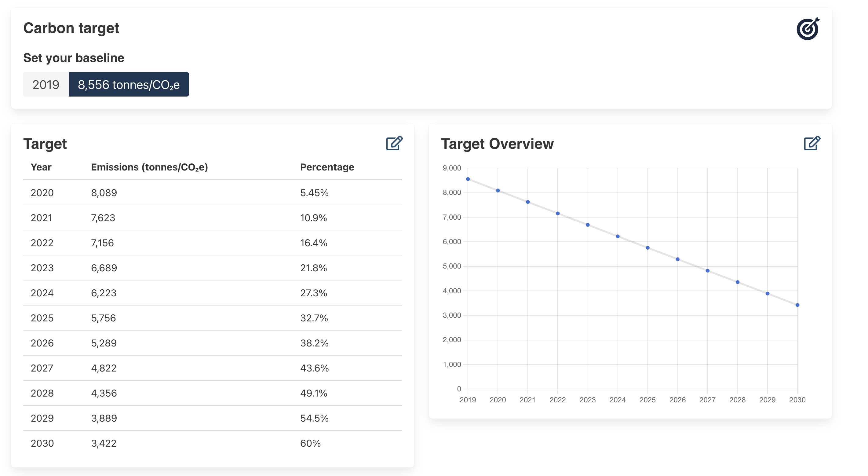 First navigate to the overview page of your instance in the Thrust Calculator, scroll down to the “Target” widget and click on the button “Set a carbon target” to open the baselining page.