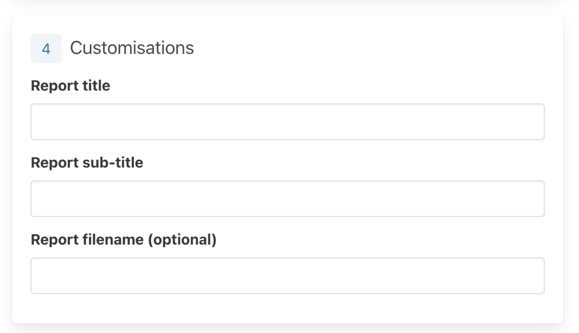 Next you can set a report title, report sub-title and a report file name. Please see an example of how the title and subtitle are formatted in the report below for reference. The report file name is what the downloadable file containing your report will be named.