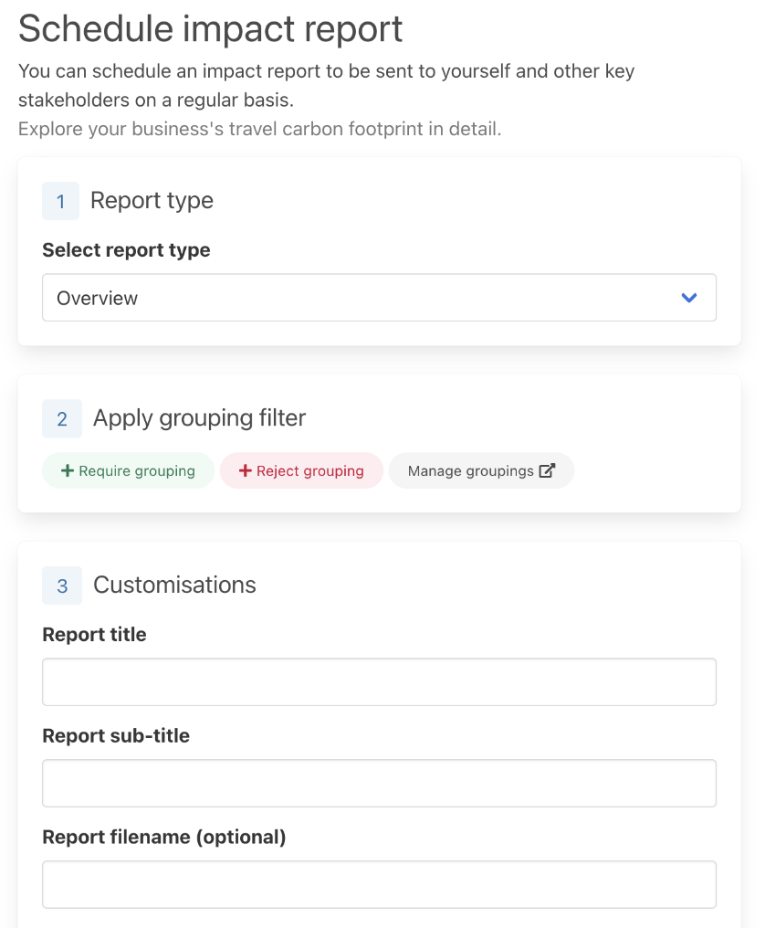 The Thrust Calculator allows white-label impact reports to be downloaded to explore your business’s carbon footprint from travel in detail. The calculator supports the creation of the following types of impact reports; overview, full, full without appendix, analysis and grouping. These can all be downloaded directly from the Calculator in pdf format and are emailed to the email associated with your Thrust Calculator account. You can also schedule an impact report to be sent to yourself and other key stakeholders on a regular basis.