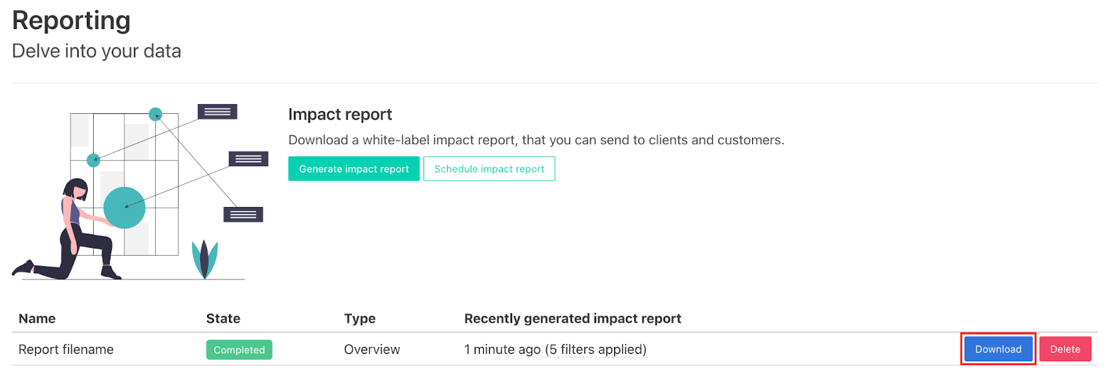 Once the report has completed being generated it’s status will change to completed and you can download a pdf copy of your report by clicking on the “download” button highlighted below. You can also delete your generated report by clicking the delete button.