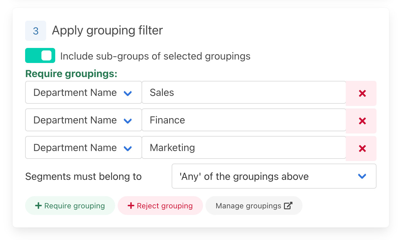 For example for the grouping type “Department Name” if you only wanted the groupings sales, finance and marketing included in the impact report you would add 3 “+ require groupings” and specify those department names.