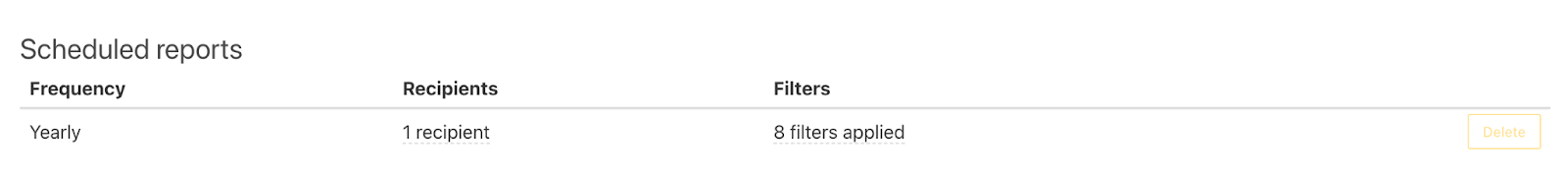 Once you schedule your report you will see a new row added to your instances report page detailing the frequency, recipients and filter of your scheduled impact report. Hover over the “1 recipient” and “filters applied” text to see the emails it will be sent to and the filters you applied to the report. You can delete your schedule report by clicking the yellow “delete” button on the right.