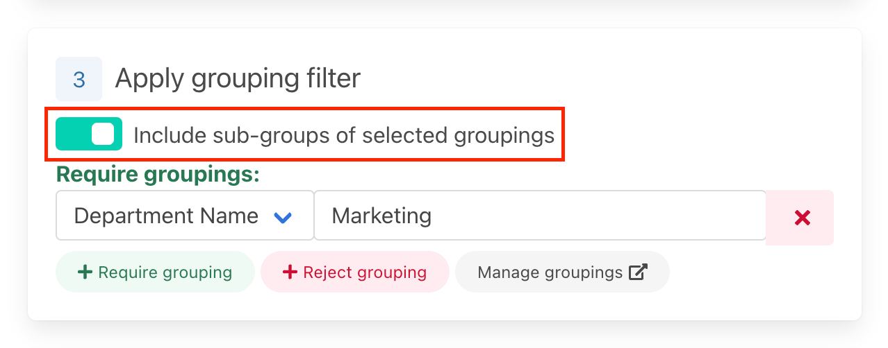 If you have set a grouping hierarchy in your instance and want to see all sub-grouping in your report as well, toggle the “include sub-groups of selected groupings” slider.