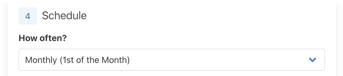 Schedule how often you would like the reports to be emailed to recipients. You can choose between monthly (sent the 1st of the month), quarterly (sent 1st of January, April, July and October) and yearly (sent on the 1st January).