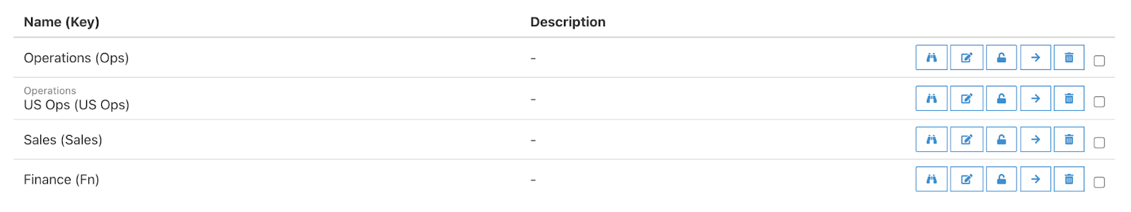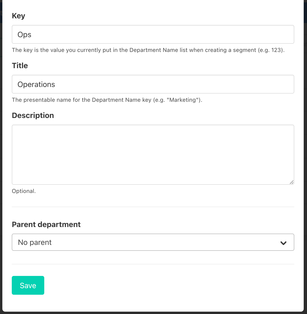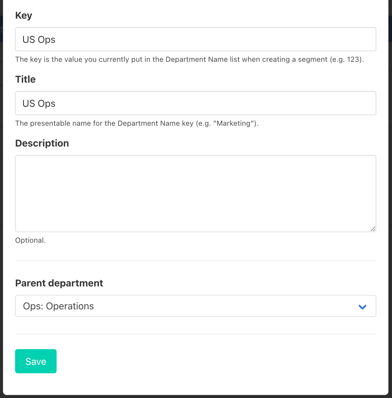 To add a grouping hierarchy under the grouping “Operations” click on the “Add grouping” button as done in step 2. Fill out the key and title as done previously, for this example we are adding a “US Ops” grouping. To set “US Ops” under the “Operations” grouping make sure to state this in the Parent department in the popout.