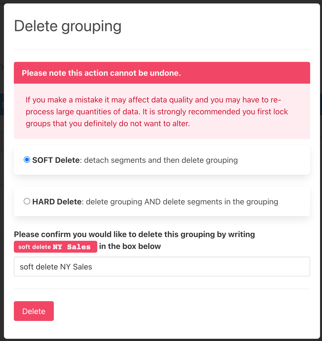 When deleting a grouping the below pop-out will appear. Make sure to specify what type of deletion you want to do;