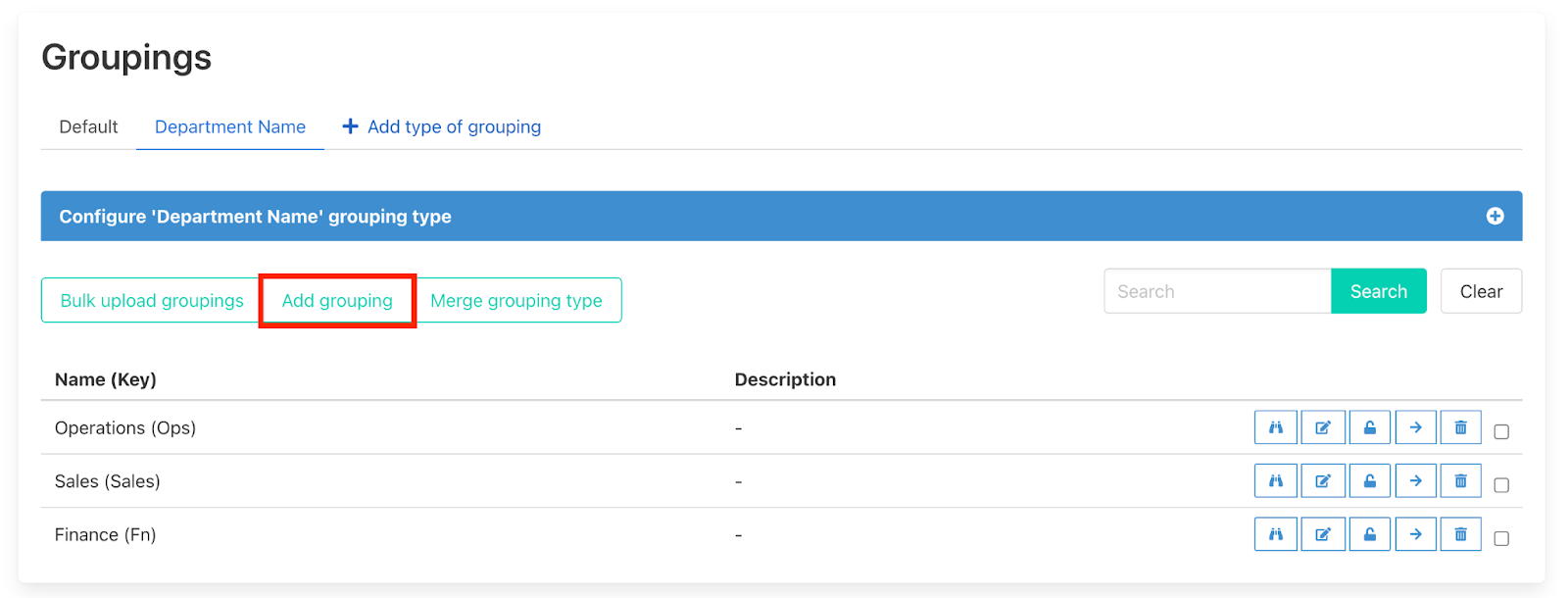 To add groupings to the grouping type “Department Name” click on the “Add Grouping” button as shown below.
