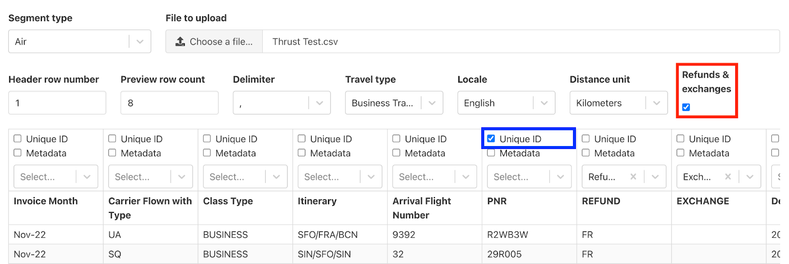 The Thrust Calculator uses the Unique Segment Identifier to "match" rows which are tagged as refunds or exchanges with the original booking row. Such that both the refunded row and the associated original booking row are removed from the calculation. If a unique segment is not included in the upload it is possible that these original bookings that are in fact cancelled will still result in a carbon emission.