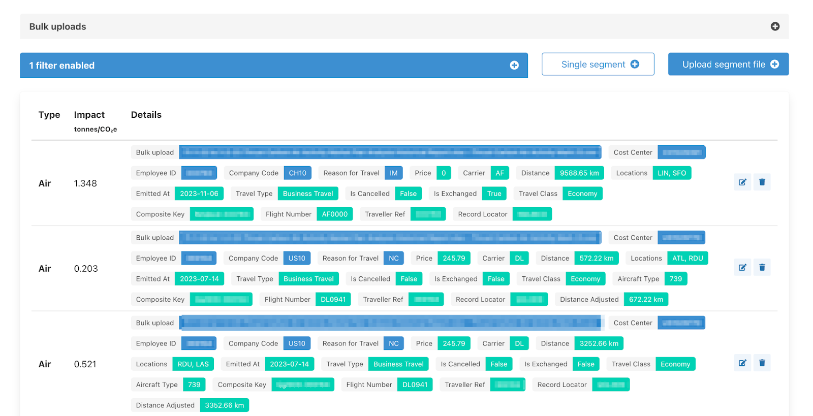 To see the individual segments within this bulk upload click on the “View Segments in Upload” button which will show you the individual emissions for each row of data uploaded in addition to all the tagged information for each segment (see below).