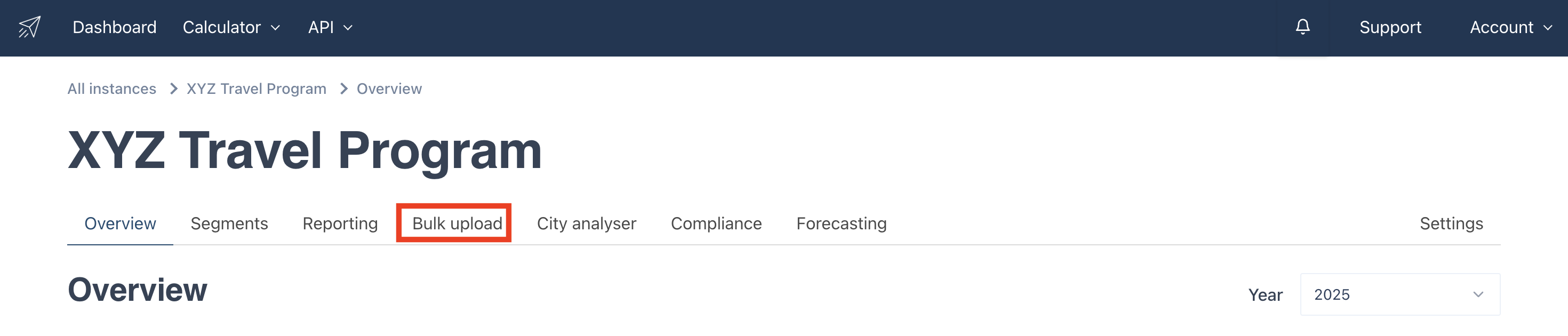 The Thrust Calculator enables full spreadsheets to be “bulk uploaded” to the system. The calculator then calculates the emissions of the activities present within the spreadsheet (travel or meetings). On completion of uploading the spreadsheet(s) it is possible for the user to generate a customised report with a breakdown and overview of all the emissions calculated through the bulk upload. This document describes the process of bulk uploading spreadsheets to the Thrust Calculator.
