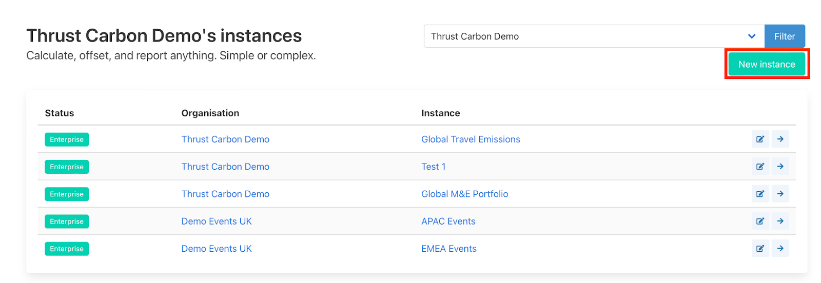 Once you have set up your organisation within the Thrust Calculator you are ready to create an instance. Instances within the Calculator help users to separate and organise projects within an organisation. For example, if you run an event agency, you might have a separate Instance for each of your customers.