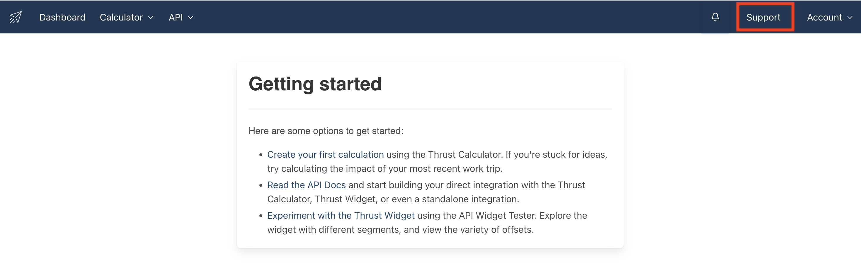 To access the knowledge base you will need to sign into Thrust Calculator. Then click the "support" button in the top right of the screen as shown below.