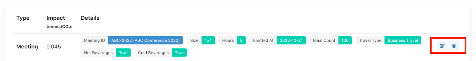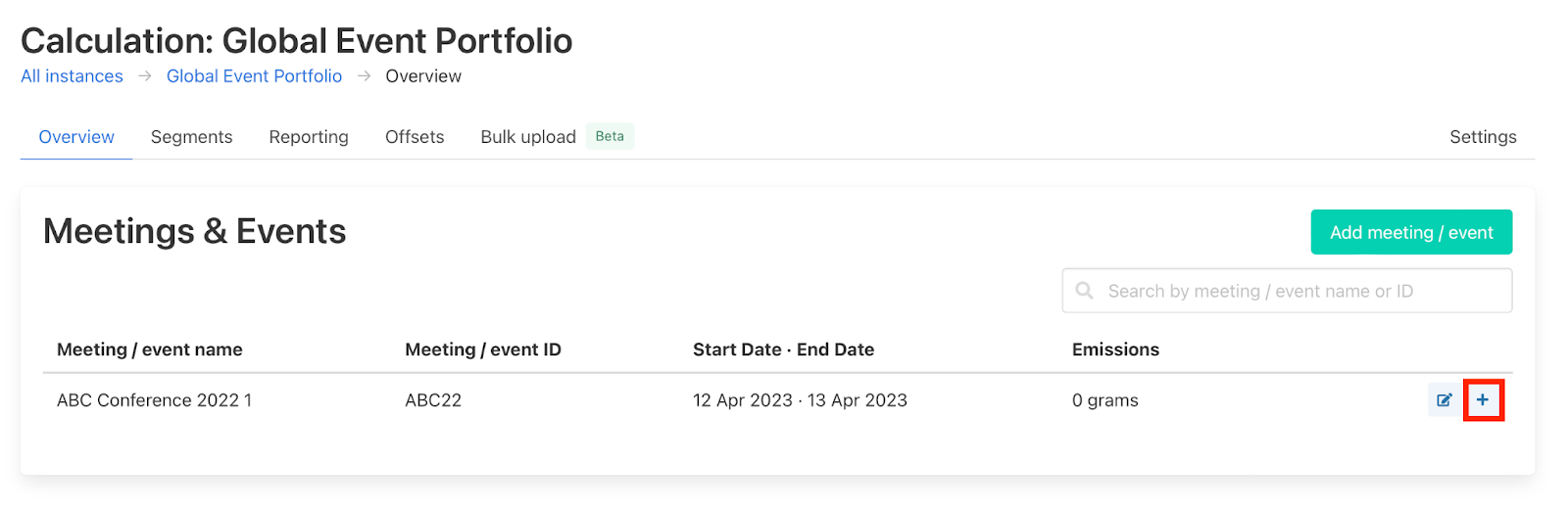 The meeting ID will automatically be pre-populated with the ID of the project you are working within. Be sure to also change the "Emission date" field to the date of the event. Once you have filled in all the data you know, click save and the segment will be added to the segment page within your project. To edit or delete the segment click the edit or delete button - see below.