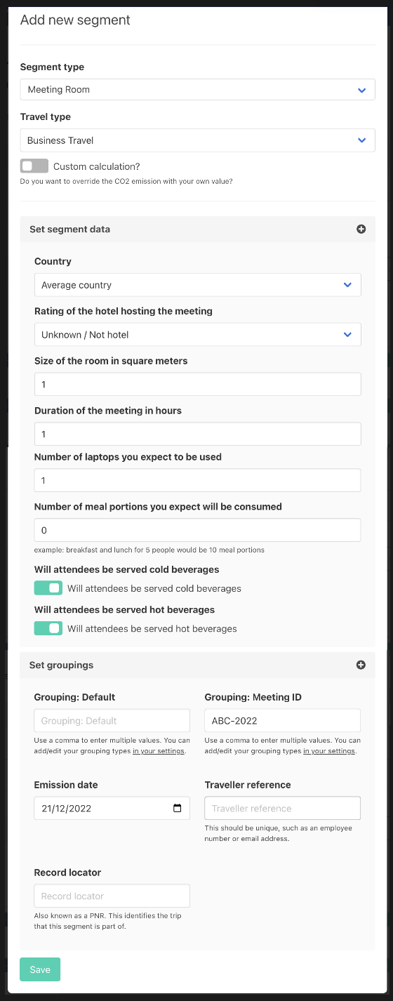 However if you have more in-depth data on the catering of the event, such as type of meal consumed (breakfast, beef, fish, poultry, vegetarian), alcoholic beverages and snacks, we advise you to not fill in the catering questions in the “Meeting Room” but to add an addition segment type “Catering - food and beverage”.
