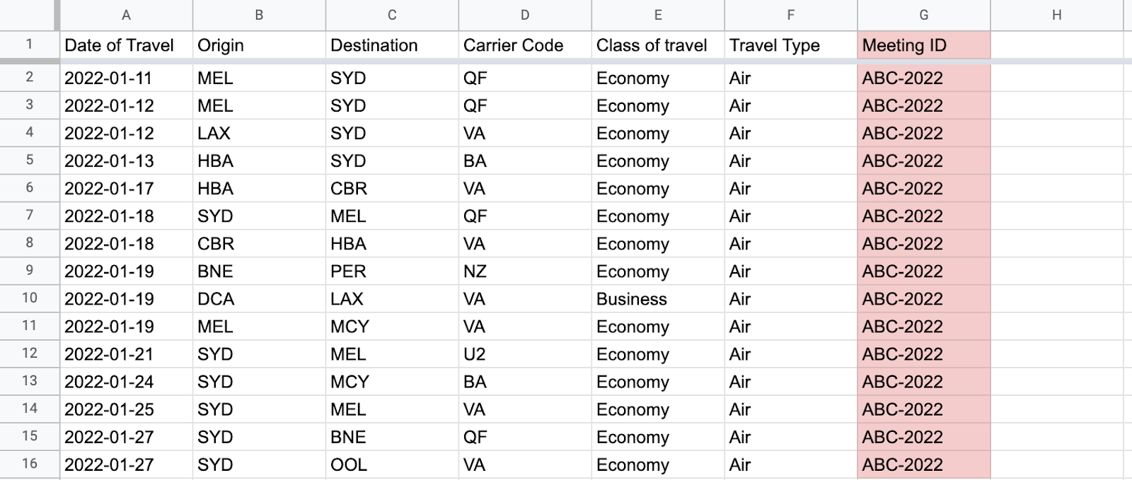 E.g. For this meeting/event, “ABC Conference 2022”, when uploading a bulk upload for air segments each row within the spreadsheet will be populated with “ABC-2022” in the new column for “Meeting ID”.