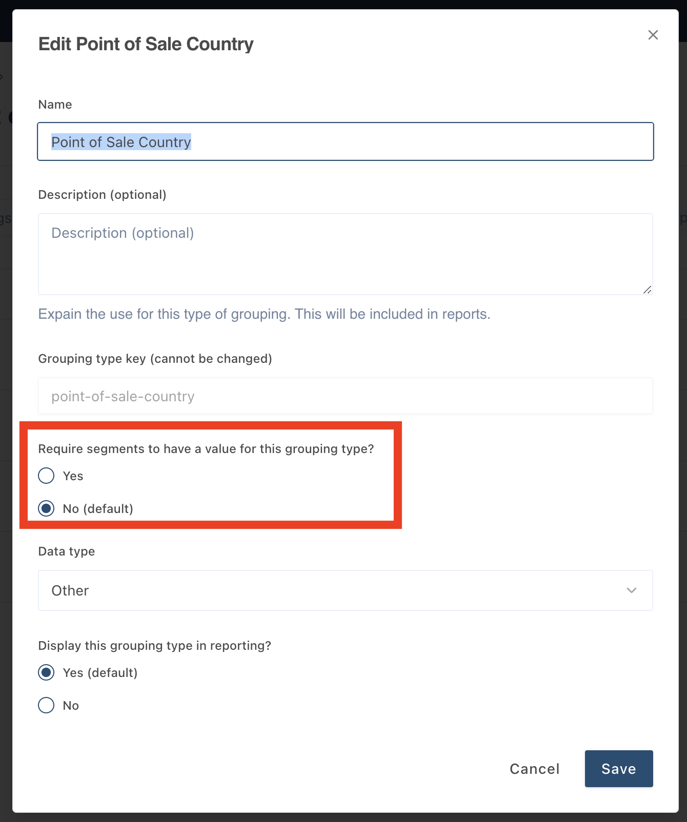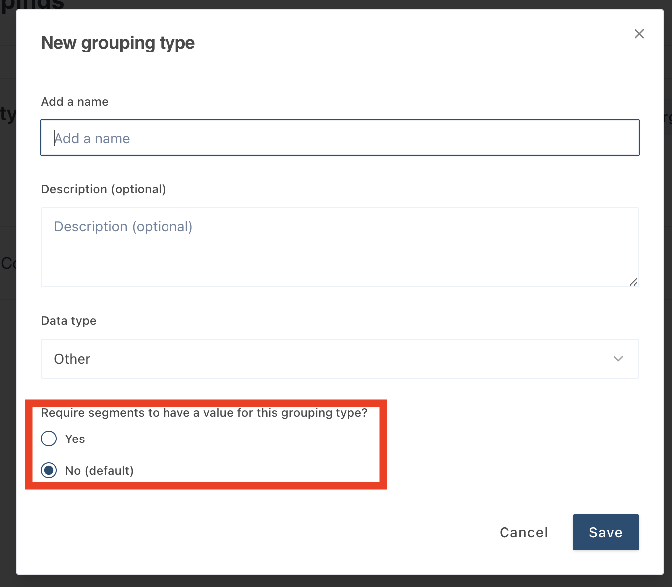 The below pop-out will appear. Fill out the name and description details. To make the grouping type obligatory check the slider for “Require segments to have a value for this grouping type”, highlighted below. Click save and you now have created an obligatory grouping type.
