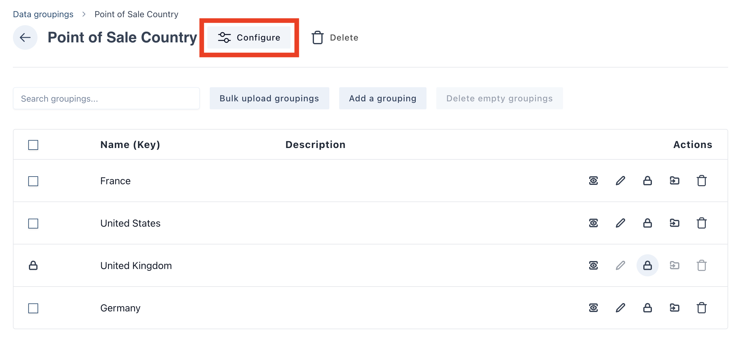 Navigate to the “Data groupings” page in the settings. Click on the “New grouping type” button as shown below.