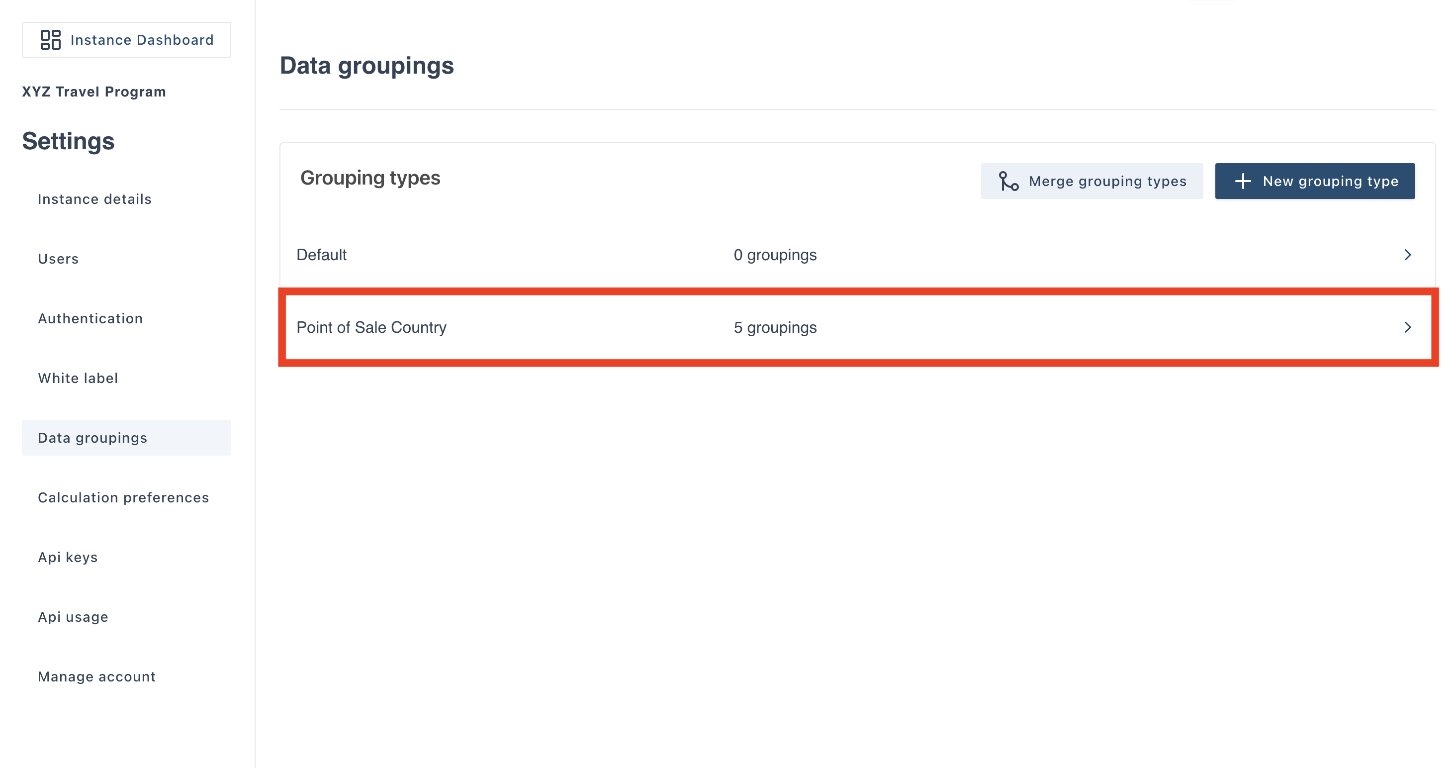 Select which grouping type you want to merge groupings within. For this example we are going to merge groupings that fall under “Point of Sale Country”, click into this grouping type.