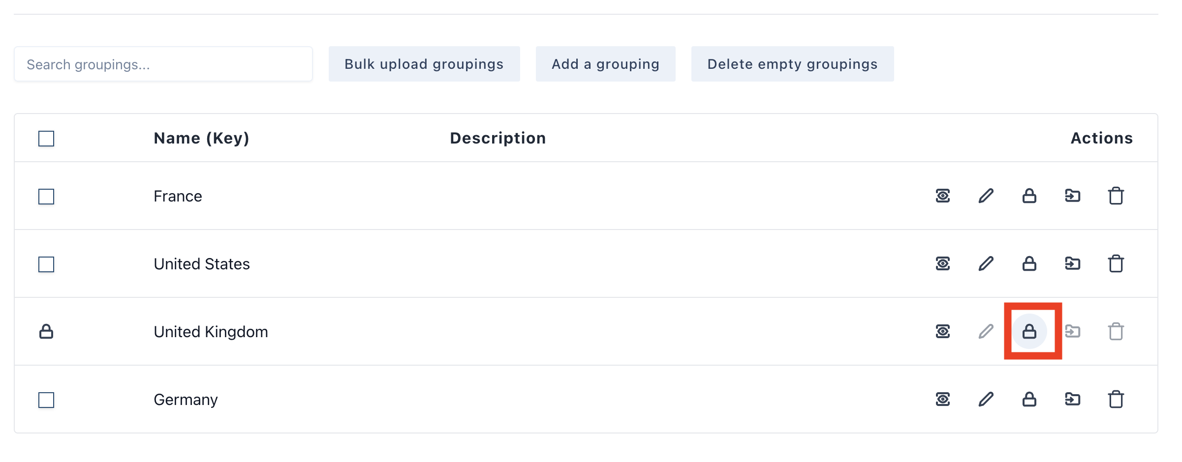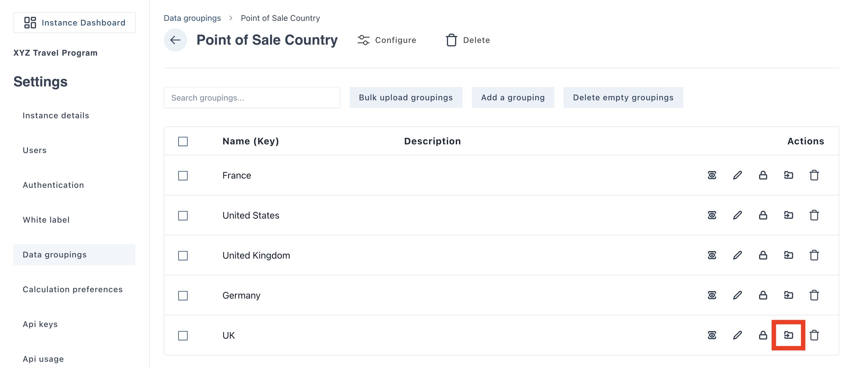 We are going to merge the grouping “UK” into “United Kingdom”. On the grouping you wish to merge click on the "merge grouping" as shown below.