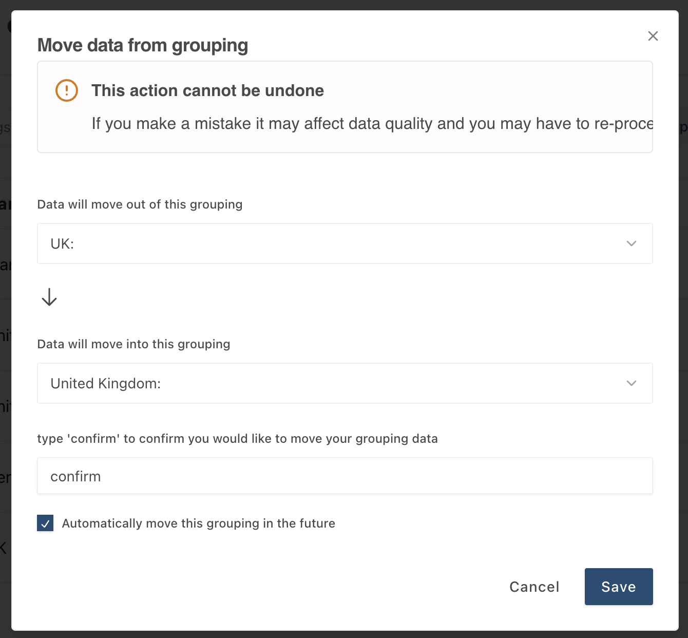 The below pop-out will appear. Select which grouping you want to merge into another grouping. Click save, now all your segments will have been moved across to the other grouping.