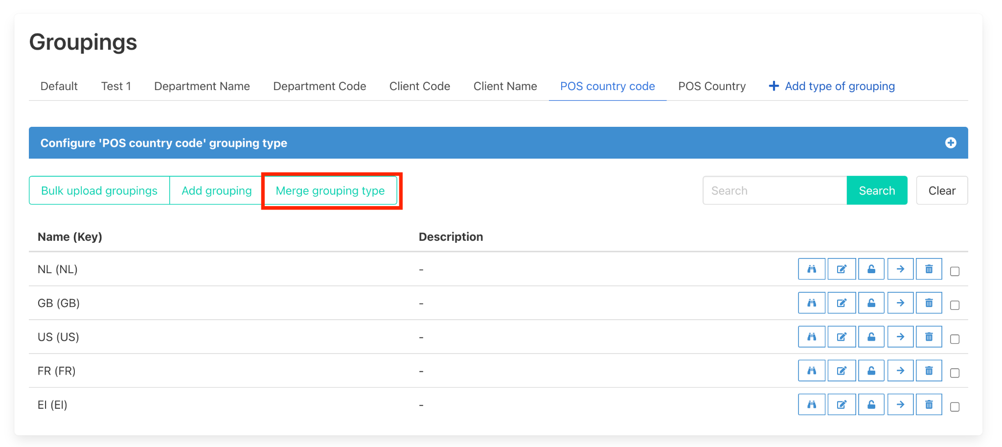 Select which grouping type you want to merge with another grouping type. For this example we are going to merge “POS country code” into “POS country”. So we click on the “POS country code” tab as shown below.