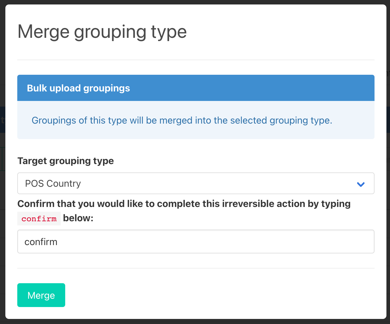 Next you will need to select from the drop down list which grouping type you want to merge into. For this example we are merging into “POS country”. Next type in confirm into the box and finally click “merge”. Note that this process is not reversible.