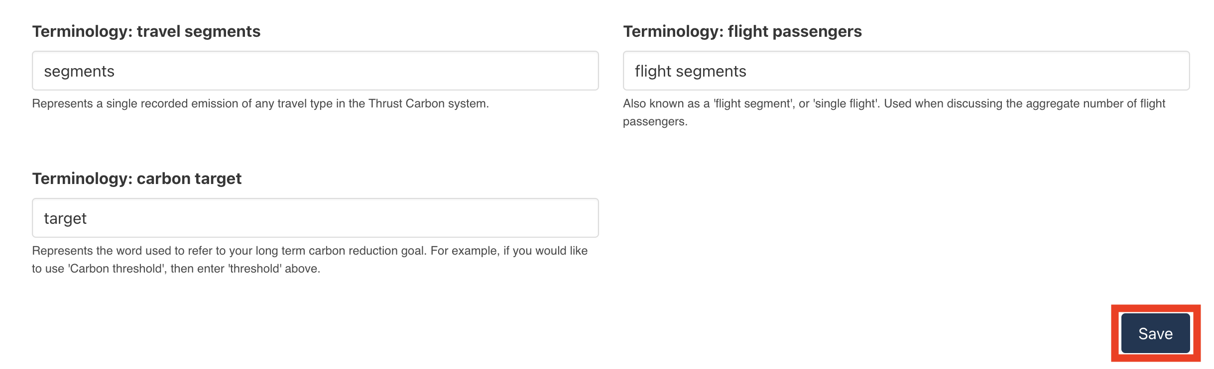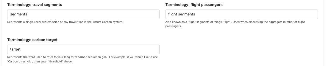 Notice that at the bottom of the Report White Labelling section there is the option to change some of the terminology that will be present in the report. While in some organisations the word "segments" will be understood by report readers, in others you might change this to "individual emissions" to make the term accessible. Similarly, the word "target" might not match your company culture - in such cases, you might wish to use the term "limit" or "ceiling".