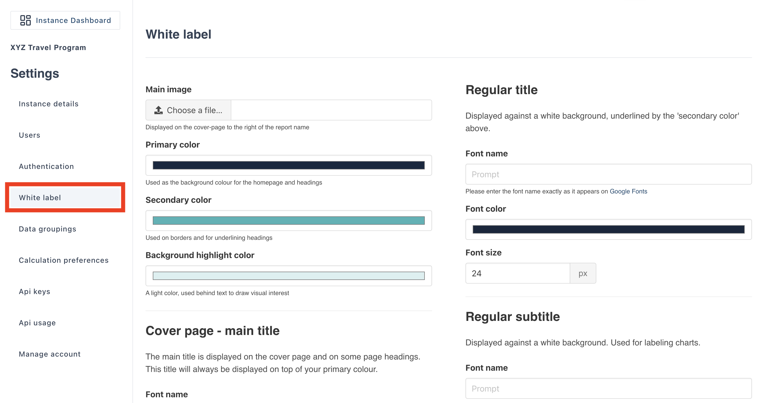 Once in the setting page scroll down to the “Report White Labelling” section, as shown below.
