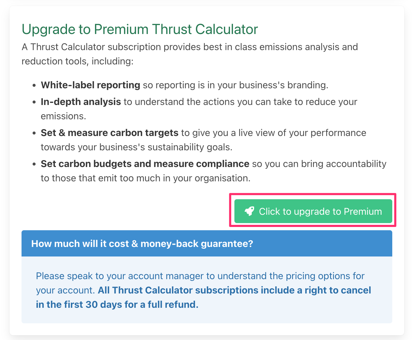 Please speak to your account manager to understand the pricing options for your account. All Thrust Calculator subscriptions include a right to cancel in the first 30 days for a full refund.