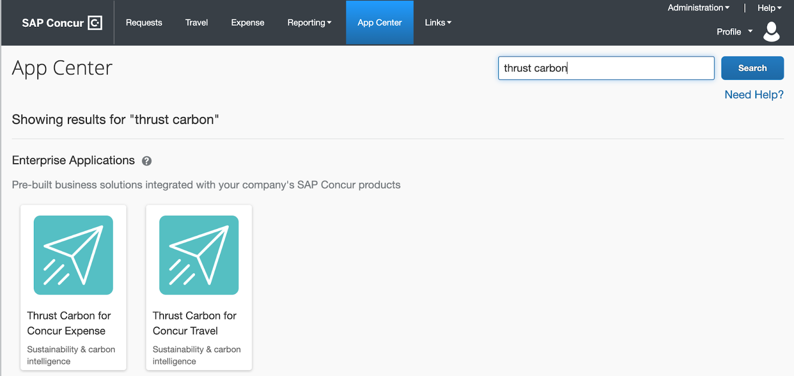 Step 2: Once in the SAP Concur App Center, navigate to the Thrust Carbon apps, and select the app/s you wish to connect to.