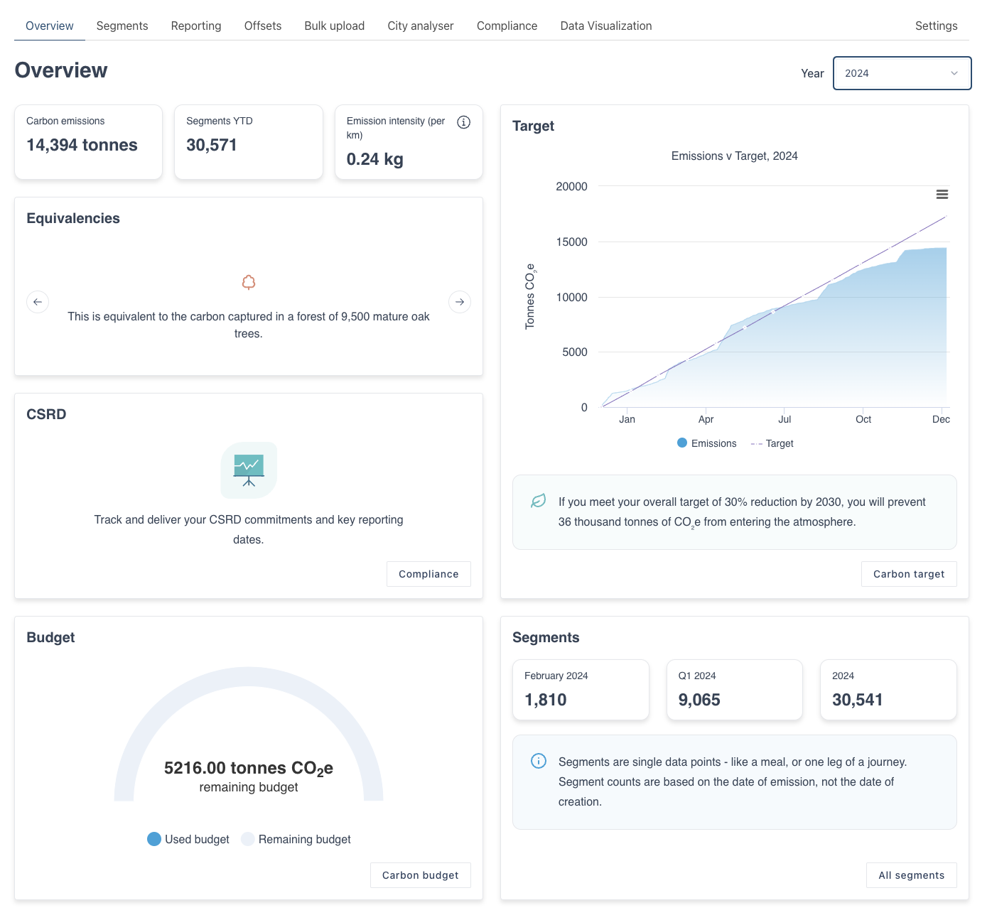 Overview: summary of your total impact between set dates, overview graphs, emissions over time and carbon target.