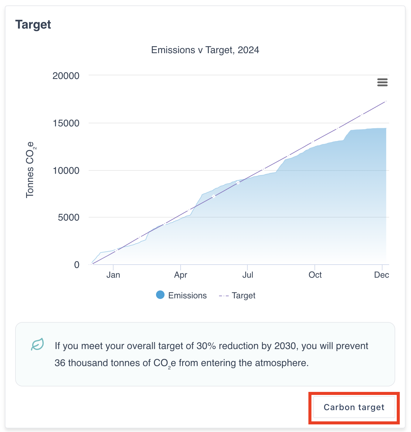 The target widget on the overview page shows the target in action, displaying a graph with the current emissions to date and the target line for the year. To view the details of the carbon target click on the “Carbon target” button.