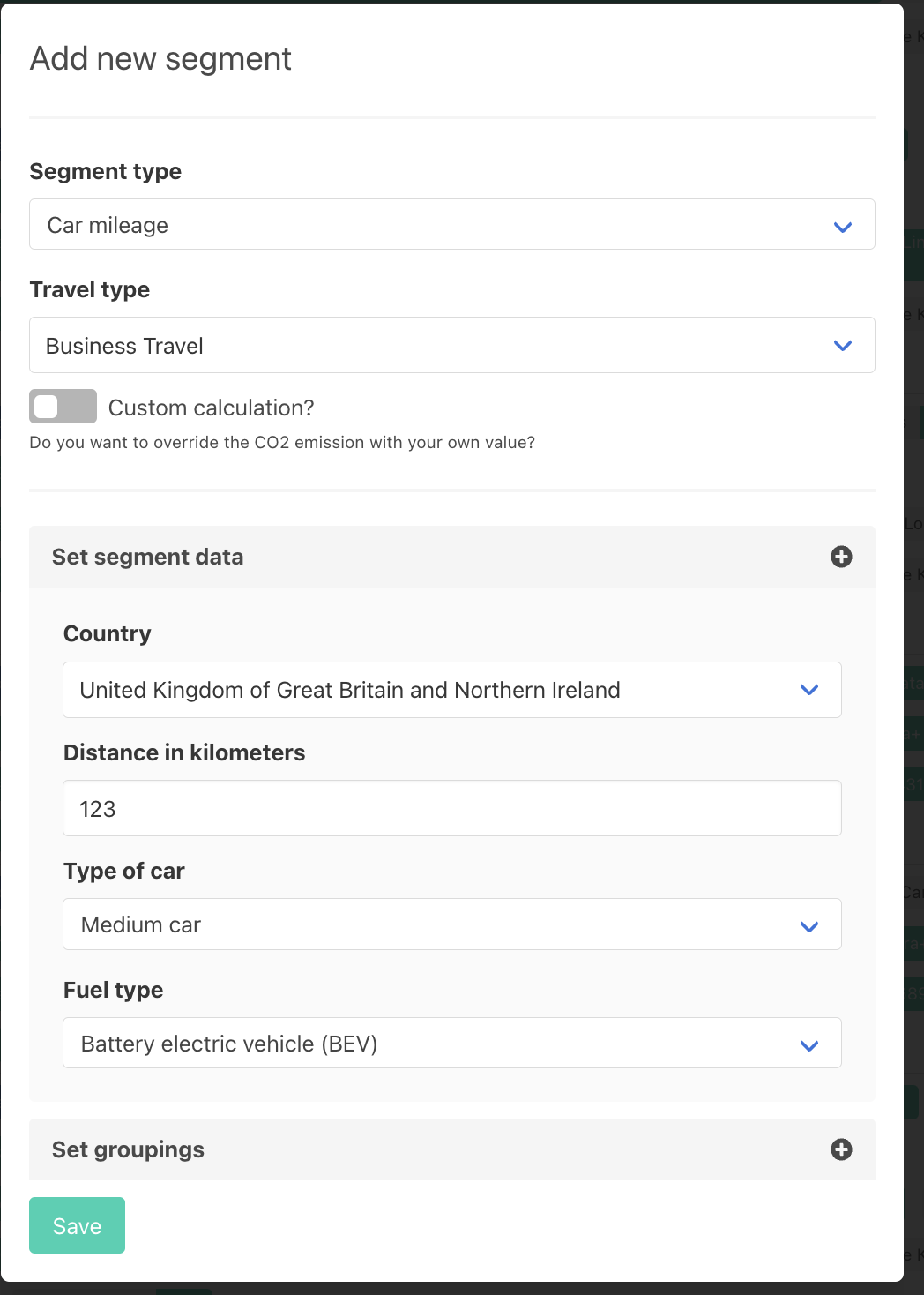 So we’ve created a Car Mileage segment type in which you can specify the driven distance, the vehicle size, as well as whether it was anything from a diesel to a battery electric vehicle.