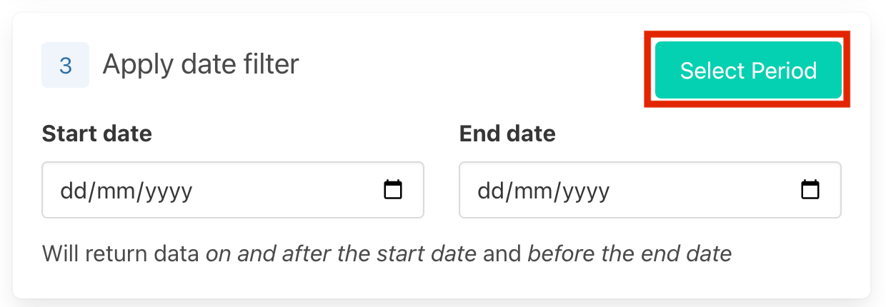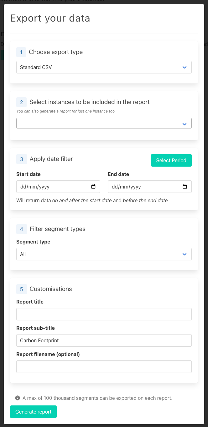 To specify the date range of the segments that are included in your CSV export, either select the start and end date or click on the “Select Period” button.