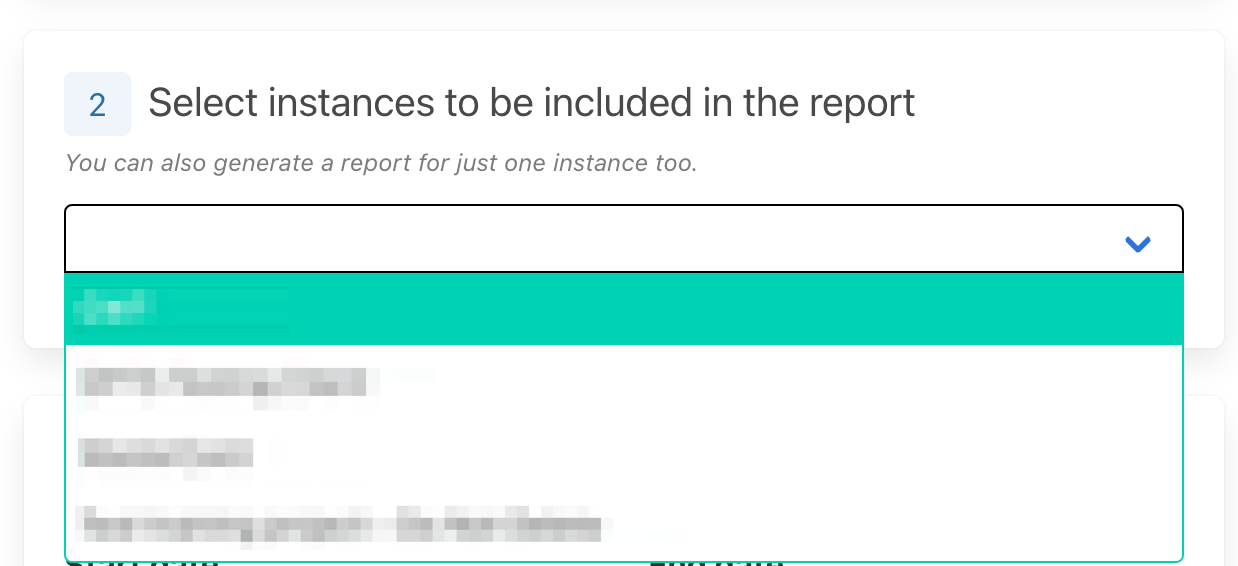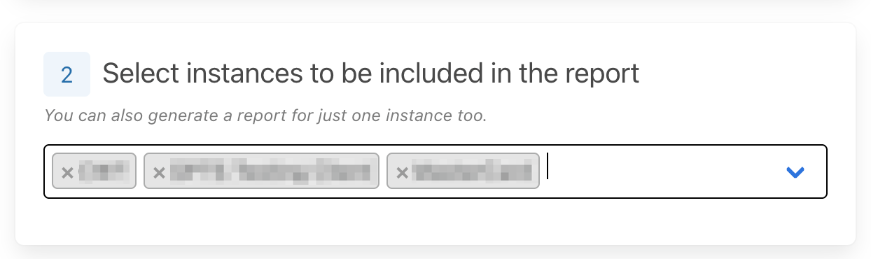 To specify which instances you want included you can either scroll through the drop down list as shown below. Or simply start typing the name of the instance into the box and a typeahead will be shown.
