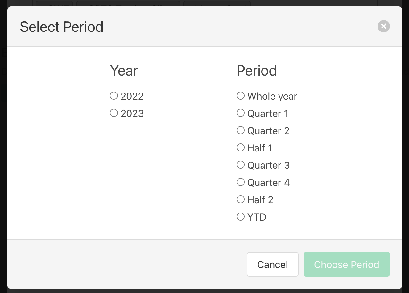On clicking “Select Period” the below pop-out will appear, and you can select which year and period to apply to your export.