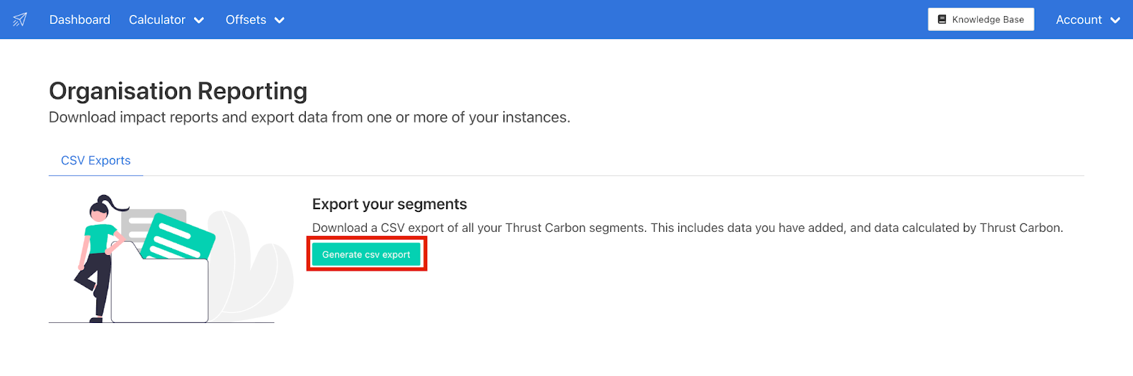 The Organisation Reporting page is available to Thrust Calculator and Thrust Event users who have access to more than 1 instance. Through this reporting page you are able to export CSV reports of multiple instances to get a full overview of the emissions from your organisation.