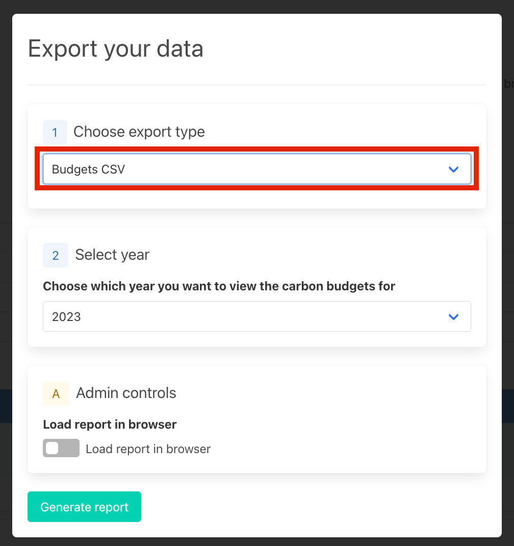 A pop-up form will appear. First you need to select the export type, select “Budgets CSV” as shown below. Note that if you have not set up any budgets in your instance this will not be an option. Next select the year that you wish to view the carbon budgets for.