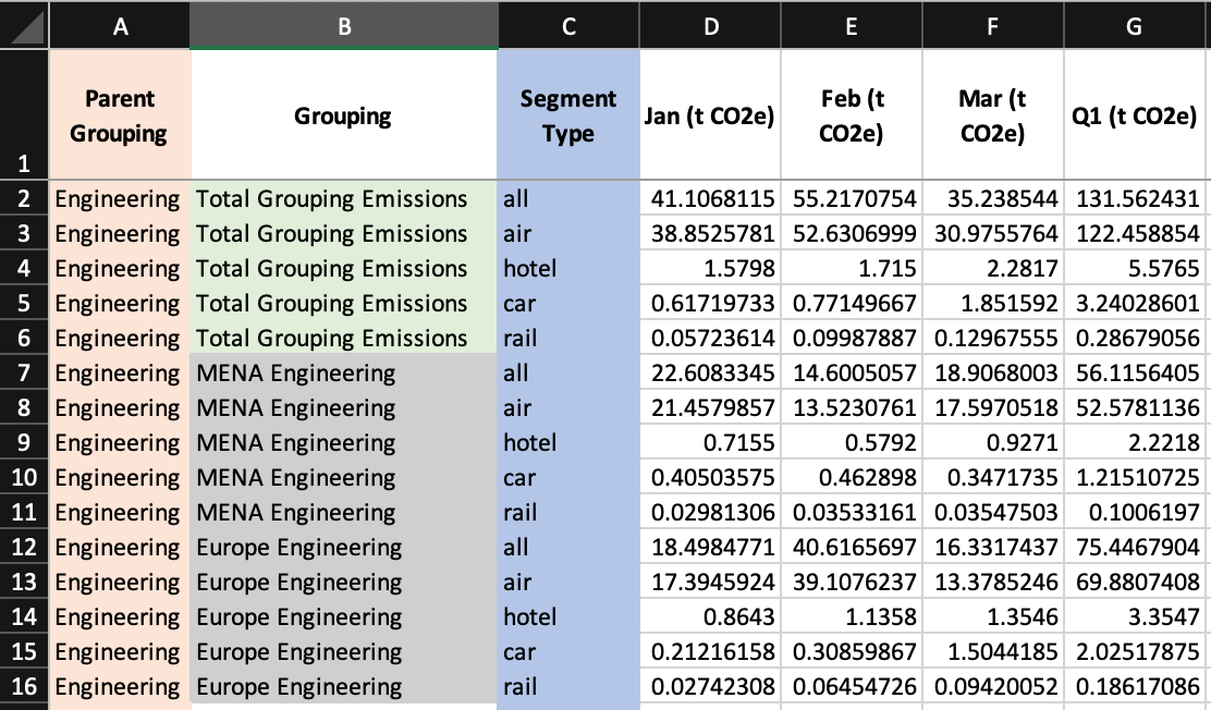 In column B, highlighted in green we also have “Total Grouping Emissions”, in these rows we can see what the total emissions are for the whole of Engineering for each segment type (Column C). For example if you wanted to know what the total emissions from Engineering were in Q1 from Air you would look along row 2 to column G (Q1) to see that the emission is 122.46 t CO2e. Likewise if you were only interested in the total emissions from MENA Engineering in Q1, you would look in cell G7.