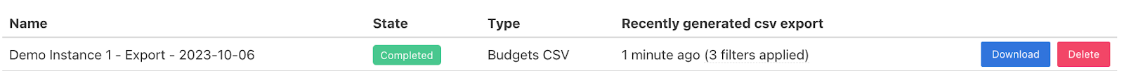 After generating your report a new row should appear with the status as pending. The name of your new file will be the “[name of the instance] - Export - [date of export]”.