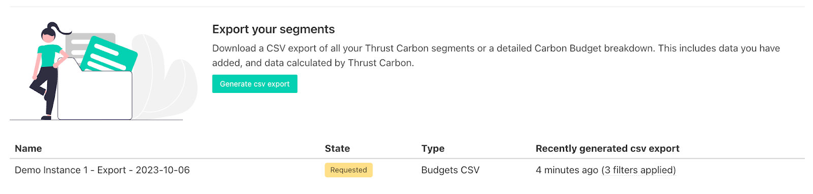 To ensure the proper accountability of travel carbon footprints many of our customers implement their full corporate hierarchy in the Thrust Calculator. However, depending on the size of your organisation you may have over 100 trackable budgets. To be useful, information about carbon budget consumption needs to be consumed in a filterable spreadsheet format. This is where the carbon budgets CSV export comes in helpful.