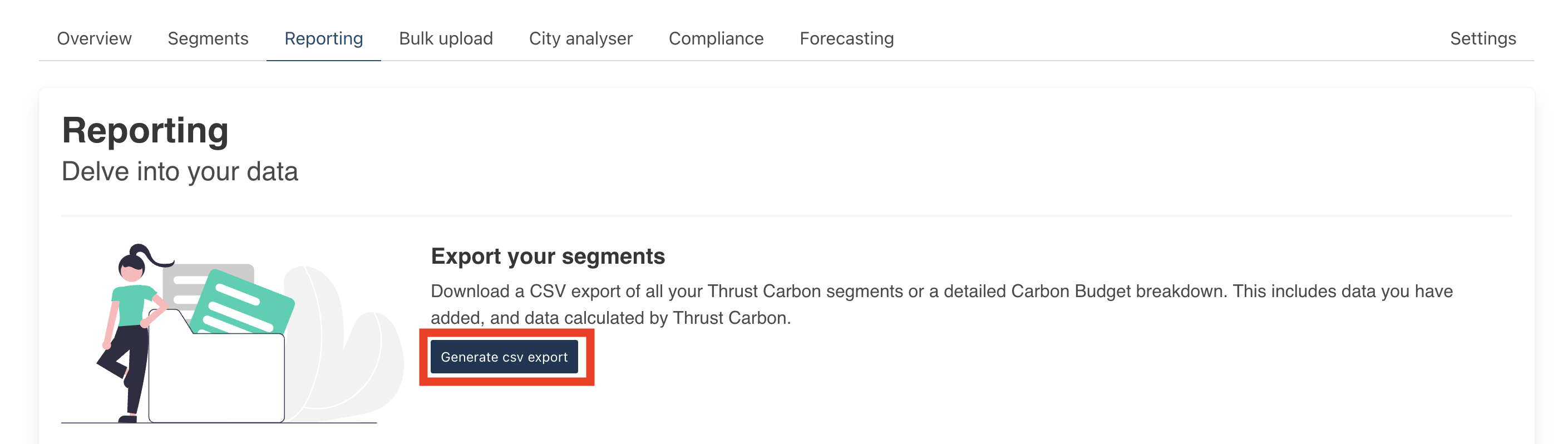 Scroll down on the reporting page to the “Export your segment” section and click on the “Generate export your segments” button outlined below.