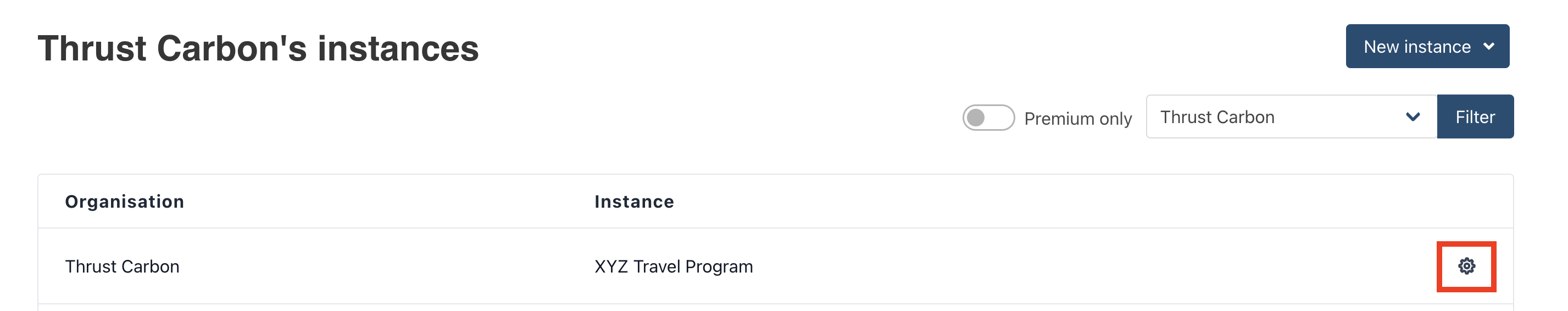 To change the radiative forcing multiplier that is used in your organisation you need to the settings. Click on the settings button next to the instance you want to edit, as shown below.