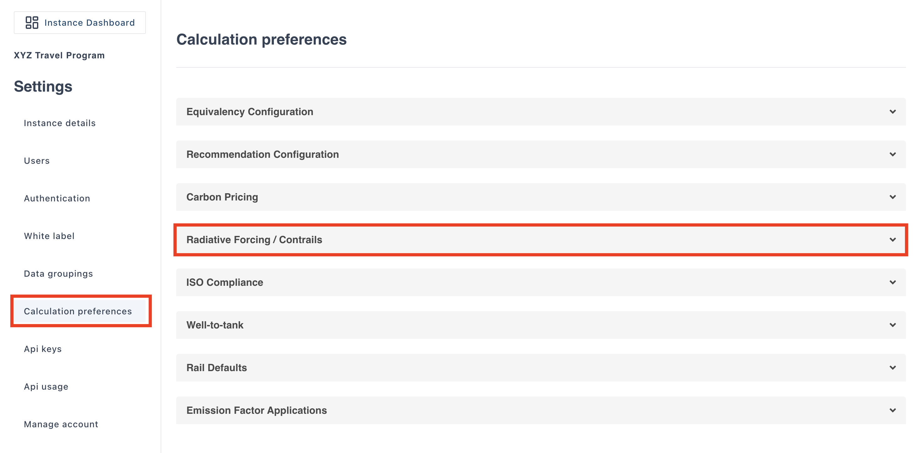 Once you are in the Settings, you need to click on the "Calculation Preferences” tab as shown below. This will reveal a list of different configurations that can be chosen. Click on “Radiative Forcing / Contrails”.