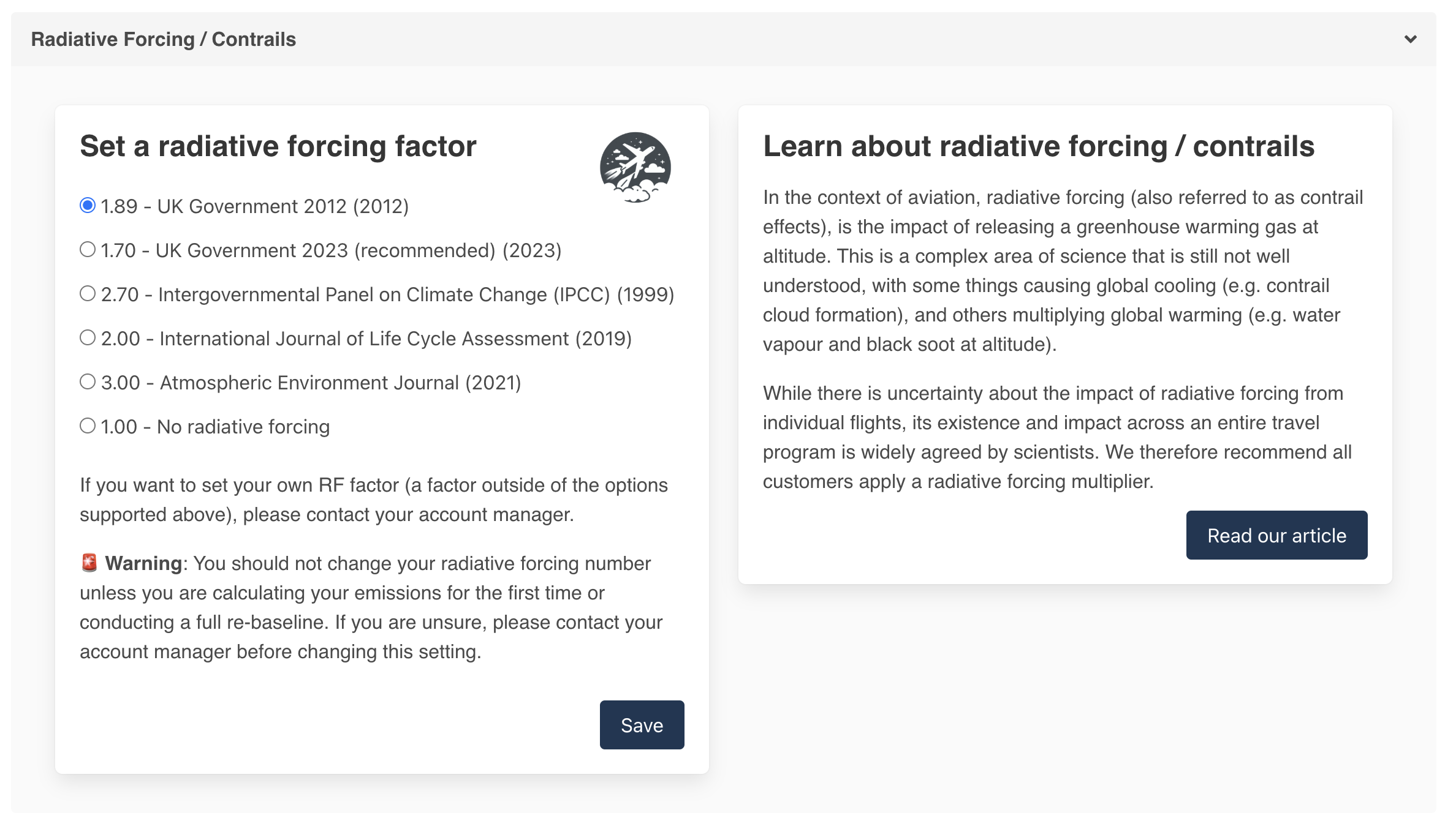 While there is uncertainty about the impact of radiative forcing from individual flights, its existence and impact across an entire travel program is widely agreed by scientists. We therefore recommend all customers apply a radiative forcing multiplier.