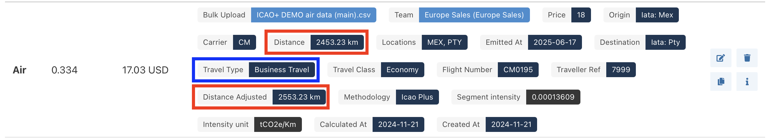 You may have noticed that on some of the air segments in your instance there is both a Distance value and a Distance Adjusted value. This difference is due to the methodology that has been used for the air segment. If the ICAO+ methodology is used then a Distance Adjusted value will be stated, as shown below.