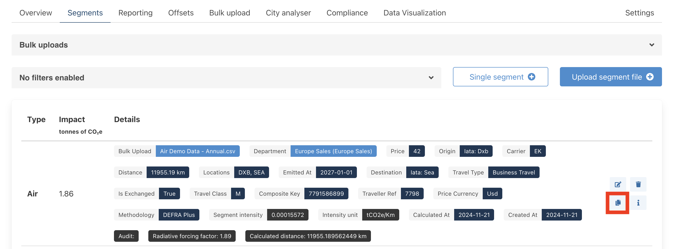 To duplicate a segment, navigate to the segment you wish to duplicate, and then click on the "duplicate" button to the far right of the segment, as shown below.