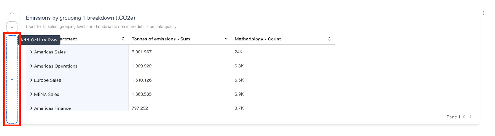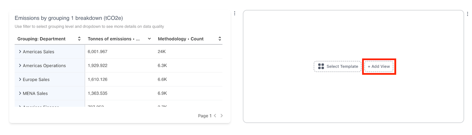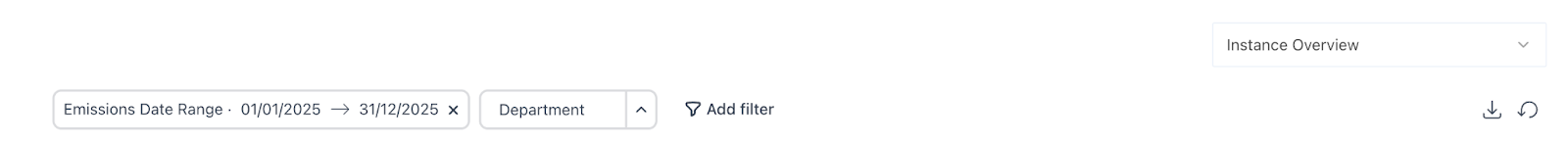 A pre-populated date filter is available at the top of the screen, allowing you to view insights for specific date ranges. You can also add additional filters to tailor your dashboard, such as viewing emissions data exclusively from the US finance team.
